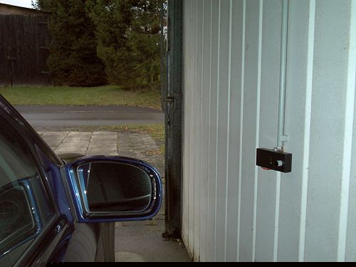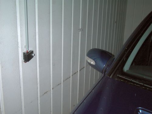 » Dieses Foto zeigt den Garagentoröffner fertig installiert. Er besteht aus einem Lichtsensor, der das Blinken registriert und einem PIC16F628 Mikrocontroller, der die Anzahl der Blinkimpulse zählt. So kann der Wagen zugeschlossen werden, ohne das Tor auszulösen.