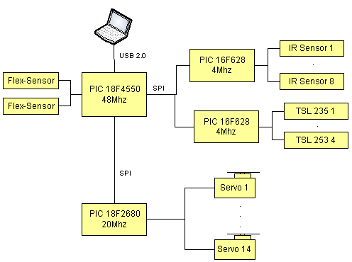 ![]() » This is a block diagram of the spiders circuitry. The main PIC (18F2550) communicates with the other PICs via the SPI protocol. Coming soon: 2 flex-sensors for direct obstacle detection (e.g. if the IR sensors fail) and 4 light to frequency converters will be mounted, enabling the spider to walk into dark or bright areas.....stay tuned. |