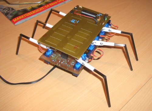 ![]() » After mounting the servos for vertical leg movement using aluminium angles, the legs could be mounted. I used carbon fibre pipes for building the legs which are mounted to the servos using some plastic pipes that I heated up and pressed into shape. This picture also shows the second PCB containing a PIC18F2550 with a USB interface. This board shall be used as the "brain" of the spider and can be extended by different sensors (see below). |