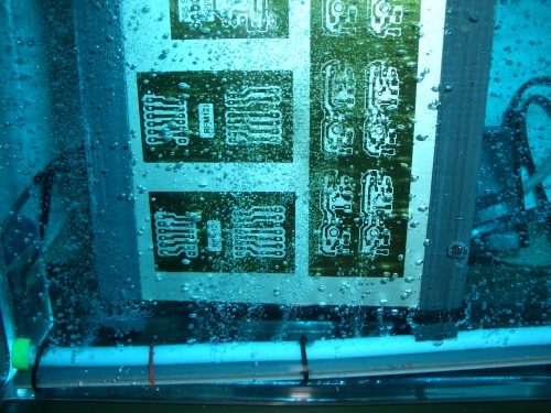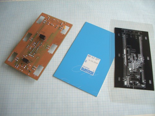 ![]() » This picture shows the etching of the PCBs. There is one small PCB for each sensor (consisting of ISF401 and an infrared LED) and an interface PCB containing a PIC16F628 for converting the parallel input of the 8 sensors into a serial bitstream via SPI protocol. |