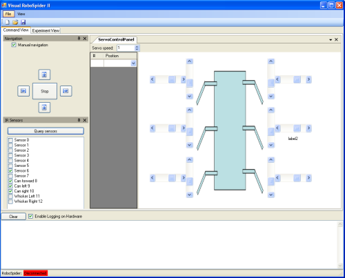 ![]() » To monitor the spider's sensors and to control the spider manually I wrote a small C# application that connects to the spider via USB. |
