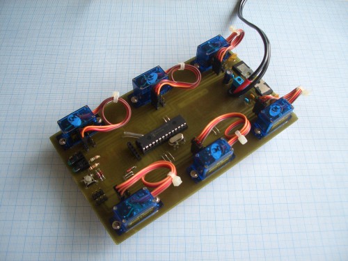 ![]() » Here the finished PCB with the 6 servos for horizontal leg movement is shown. On the right you can see two voltage regulators. One supplying 5V (1A) for the PIC (and other devices later on) and the other supplying the servos with 6V (2A). |