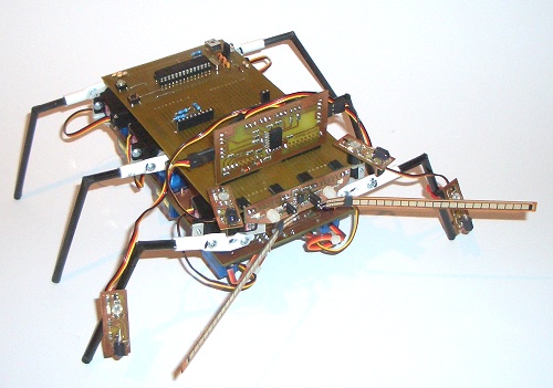 Microcontroller: PIC18F4550 - The brain PIC18F2680 - Servo controller (up to 14 servos) and motion engine PIC16F628 - SPI-Interface for up to 8 infrared obstacle sensors PIC16F628 - SPI-Interface for TSL 235 light sensors Sensors: 8x infrared sensor Sharp IS471 2x flexible bend sensors as whiskers 4x TSL 235 light to frequency converter for detecting light conditions Actors: 6x 9 gramm micro servos for horizontal leg movement 6x Hitec HS82MG servos for vertical leg movement Video: Spider in action |