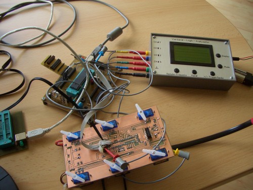 ![]() » Programming and testing the servo board using my PIC18F4550 demo board and a logic analyser for debugging the SPI communication. |