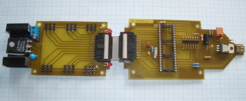![]() » For controlling the robot I want to use a PIC18F4550 for which I made corresponding PCBs that are tailored to the design of the hexapod. It consists of two parts. One PCB contains the PIC and its own 5V power supply and the other the servo connectors plus the 5V servo power supply. The advantage of this design is that there is less noise the servos cause exposed to the voltage of the microcontroller and any of the two boards can be replaced by a new PCB without the need to build the whole system new. |
