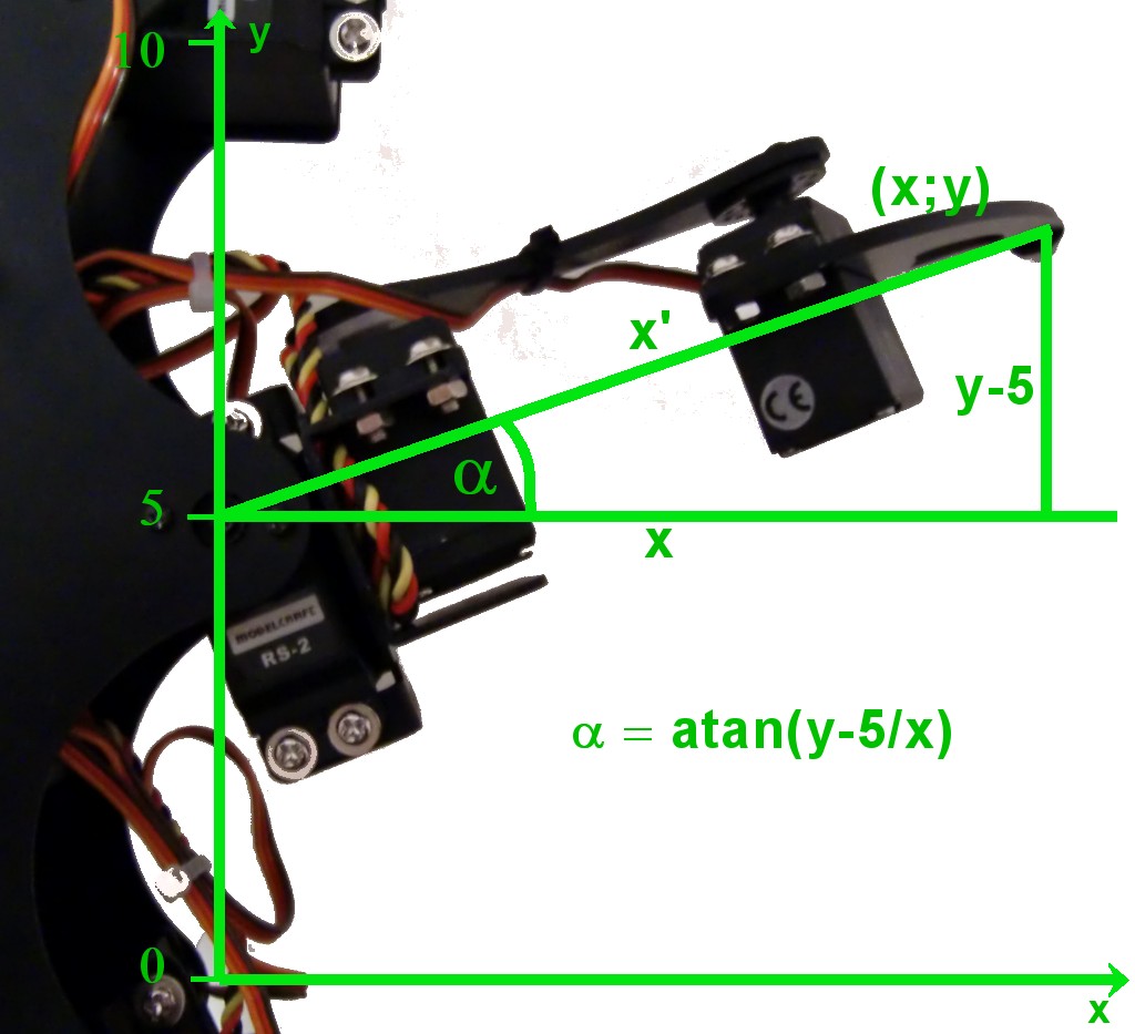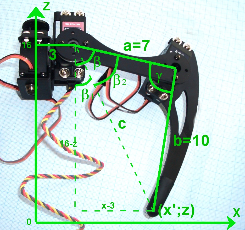 ![]() » For the vertical leg positioning (along the z-axis) things are getting more complicated. But let's see... First of all you may notice that the value x' is not neccessarily the x value of the coordinate because if y is not equal to 5 the leg is not parallel to the x-axis so the end of the leg is more distant from the mounting point than x (see picture of horizontal movement). But we have calculated x' already above. Let's start with the calculation of the angle beta (for servo 2) which is the sum of beta1 + beta2: