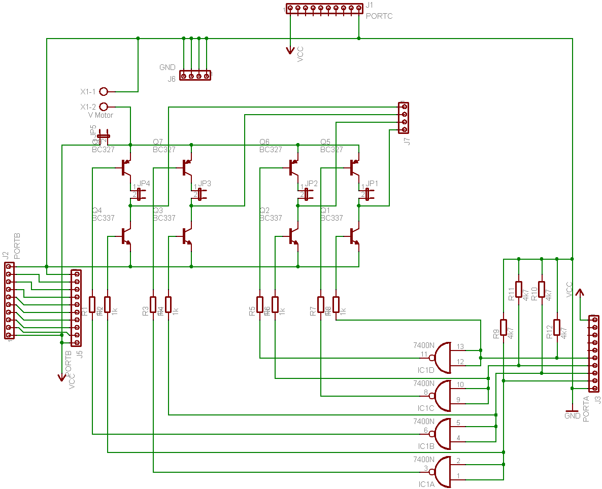 ![]() » The circuit for controlling the stepper motor. It is comprised of two H-Bridges and can be used to control bipolar (in my case) and unipolar stepper motors by configuring the jumpers between the transistors accordingly. The PIC controls the motor using PORTA<0:3>. PORTC is only for power supply and mounting the whole thing on one of my prototyping boards (see 1. picture lower board, description coming soon....). PORTB is just passed through from the prototyping board in order to connect the SRF04 range finder. It is simply connected to 5V, GND and PORTB3 (Trigger) and PORTB7 (Echo). |