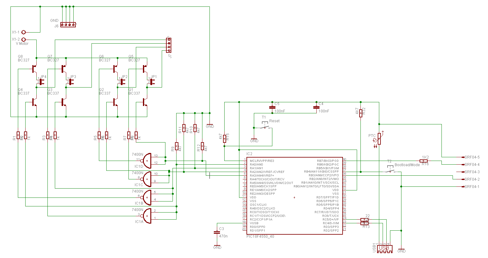 ![]() » The above picture shows the complete circuit including the connections to the PIC18F4550 and the SRF04 range finder. A tutorial for setting up the whole stuff can be found here. |