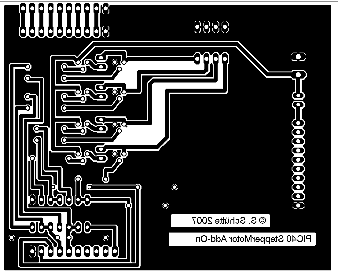 ![]() » This is the stepper control board based on the circuit above, seen from the top (non copper side). |
