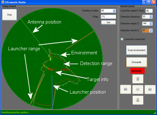 ![]() » This picture shows the final application and the meaning of the UI elements. So how does it work? First the radar is started as usual. After the radar has turned around completely, you press "Scan Environment" to let the application know that the detected targets are the normal environment (walls, chairs, etc...). The application automatically subtracts the adjusted "Detection tolerance" from the distance of the detected environment to set the targeting range. This is the area in which targets are detected. Now you press "Arm" to activate the launcher and the detection algorithm. As there is no possibility to find out into which direction the launcher is turned, the application simply instructs the launcher to turn to the left for a certain number of sconds. As this is enough for the launcher to turn around completely the application now "knows" the launcher's position. Of course once in the beginning it has to be adjusted manually according to the radar position. Now, if there is a target within the detection range (the red area) the application turns the launcher to the nearest detected target and fires. Again, as there is no way to determine the launcher's direction the turning time is calculated based on the difference between the launcher and the target direction. If the launcher turns too long or too short, you have to change the value in the "Launcher speed" selector. The adapted Visual Studio 2005 project is available here. The PIC project for the radar is the same as above. |