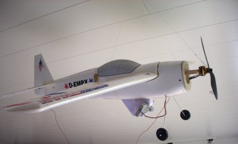 ![]() » Anbau der Kamera: Die Kamera wird einfach mittels Styropor-Halterung unter einem geeigneten Flugzeug befestigt (hier: Stuntman von Multiplex). Da der Flieger mit einem Brushless-Antrieb ausgestattet ist, macht sich die Kamera im Flug lediglich dadurch bemerkbar, dass der Flieger statt bei 1/2-Gas erst bei 3/4-Gas senkrecht in die Lüfte steigt. ;-) |