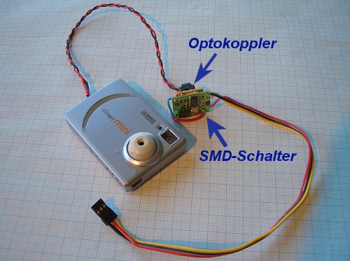 ![]() » Vorbereiten der Digitalkamera: Der Auslöser wird mittels SMD-Schalter, welcher durch einen Optokoppler vom Stromkreis der Kamera entkoppelt ist, betätigt. Die Kamera hat eine Auflösung von 1 MPixel und wiegt ca. 40g. |