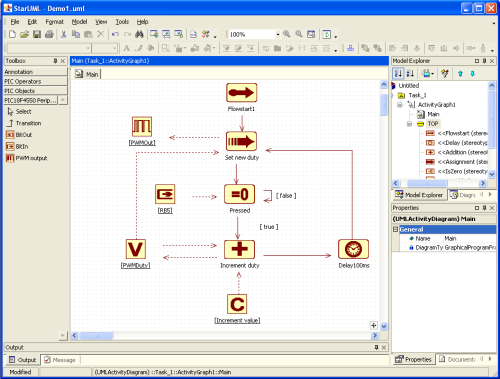 » Introduction This project is a plugin for the popular Open Source UML/MDA Platform StarUML . The plugin extends StarUML with some new UML elements for modelling, compiling and downloading an application (via USB) to the microcontroller PIC 18F4550. This project does not comprise full modelling capabilities for all peripherials of the PIC but shall serve as inspiration and/or basis for your own extensions. The following picture shows a screenshot of StarUML with a small application model that creates a changing PWM signal. ![]() (click to enlarge) Dashed lines show the object flow (the usage of objects by the activities as input or output) while solid lines are used for modelling the program flow, e.g. the transition between different activities. | ||||||||||||||||||||||||||||||||||||||||