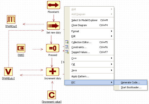 » Finally the code generator is started using the menu "Tool/PIC/Generate code..." or the context menu of the diagram: